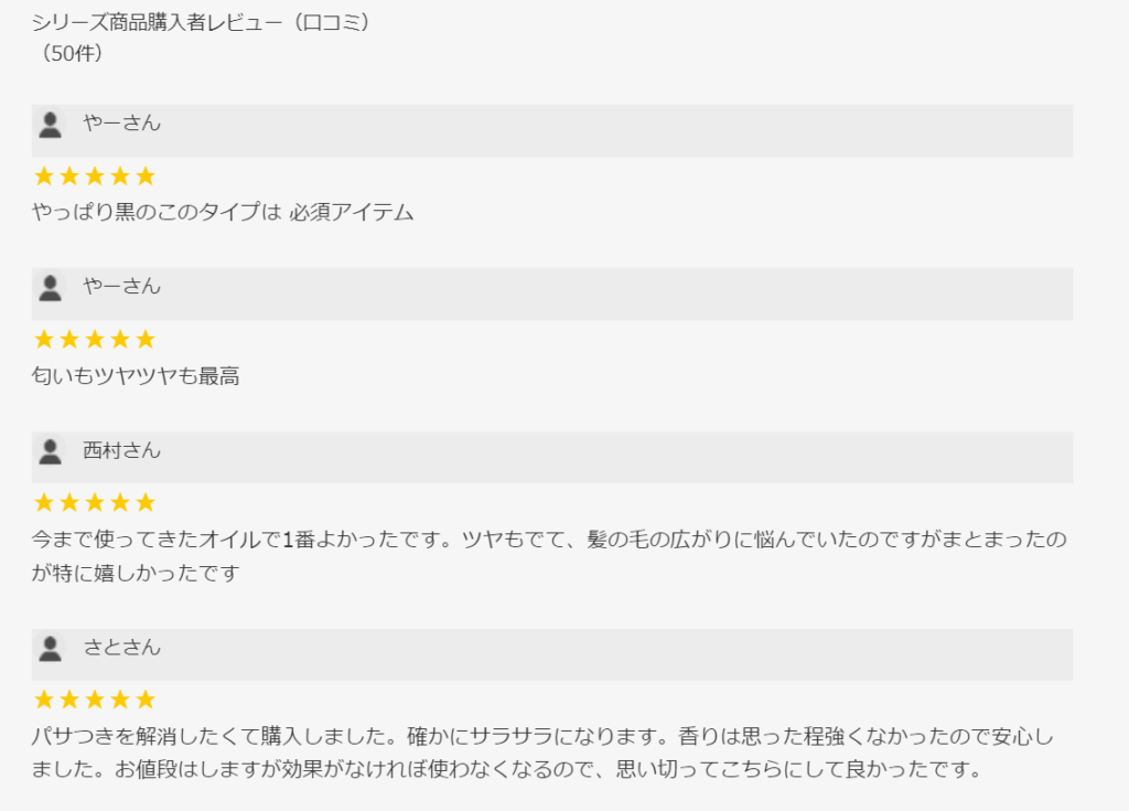 また、パサつきのある髪がまとまりやすくなるなど、使用感に対する満足度が高いことが伺えます。