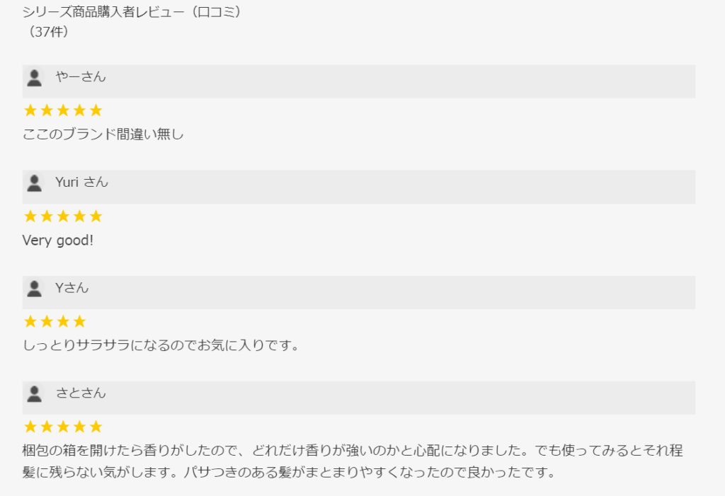 顧客レビューによると、このシャンプーは匂いやツヤ、さらには髪のまとまりやパサつきの解消に優れた効果を発揮すると評価されています。