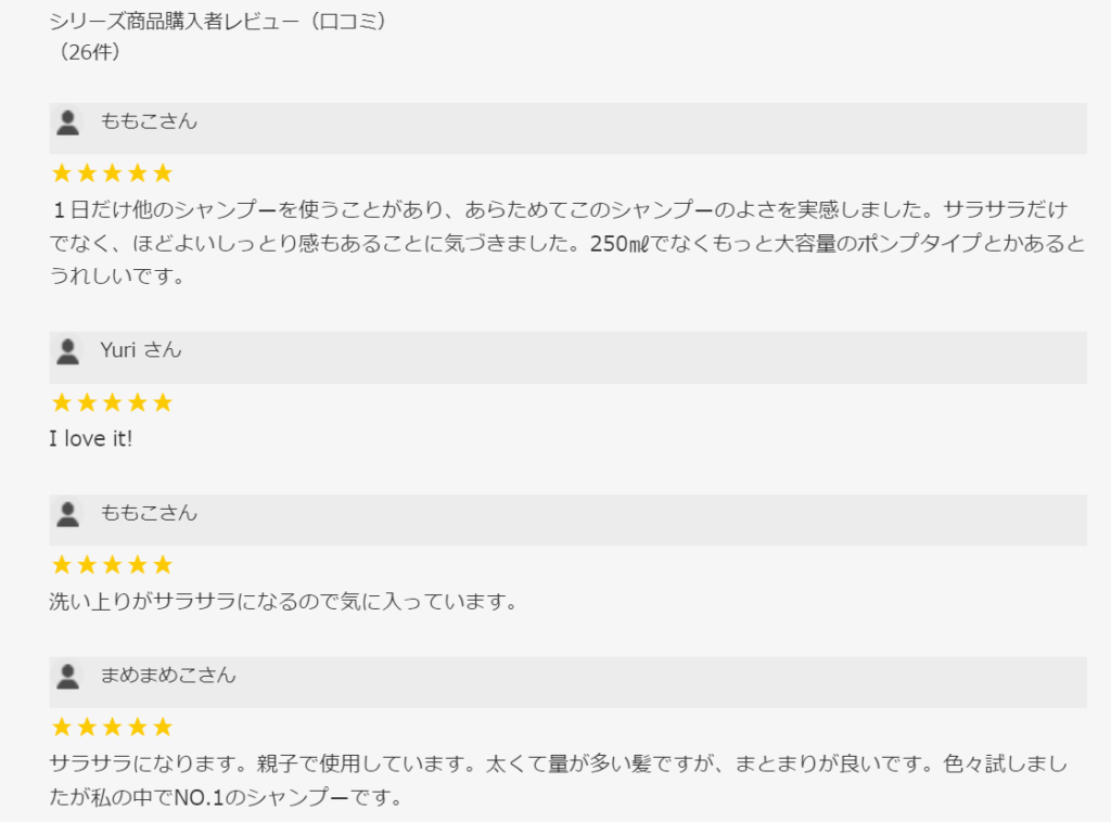 7.顧客の高い評価: ユーザーレビューでは、このシャンプーのサラサラとした洗い上がりやしっとり感、まとまりの良さなどが高く評価されています。特に、太くて量が多い髪の方にも効果があり、多くの方がリピーターになっていることが分かります。