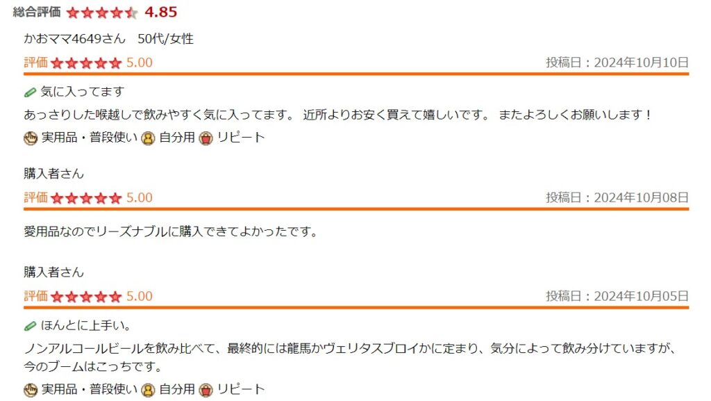 龍馬1865は、ノンアルコールビールとして全体的に高評価を受けています。