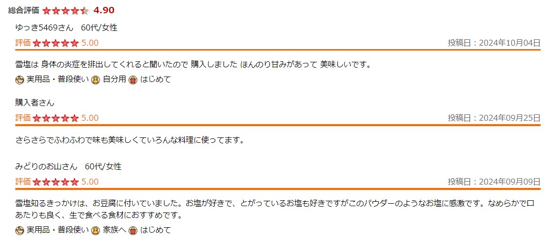 雪塩の口コミを確認すると、多くの人がその特有のまろやかな味わいやミネラル豊富な成分を評価しています。