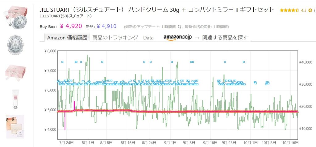 『ジェル チュアート』のコスメの売れ行きを見てきましたが、「結構売れてるな~」というのが私の率直な感想でした。意外だったのが楽天とAmazonの価格差が大きいことです。楽天ファンの私でさえもジルスチュアートの商品はAmazonで買うことを大前提に考える事にしました。