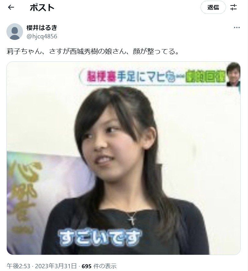 西城秀樹さんの長女と言われているX(Twitter)の画像です。