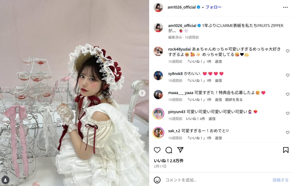 FRUITS ZIPPERに加入してからも、そのビジュアルは健在で、雑誌の表紙を飾ったり、特集が組まれたりすることも増えています。