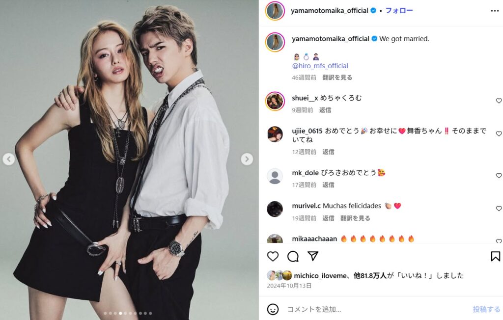 ✅結婚発表日は山本舞香とHiroのお母さんの誕生日である10月13日だった