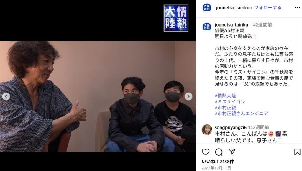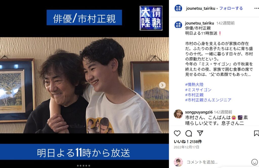✅ 長男の市村優汰は、父と同じ俳優の道を進み、舞台やドラマで活躍している。