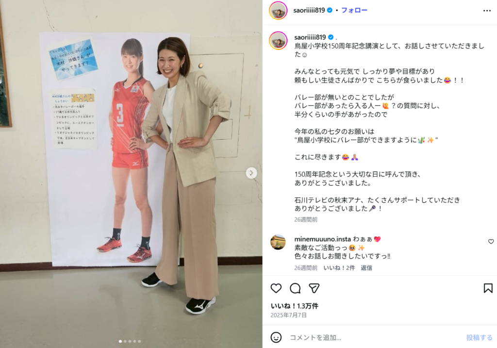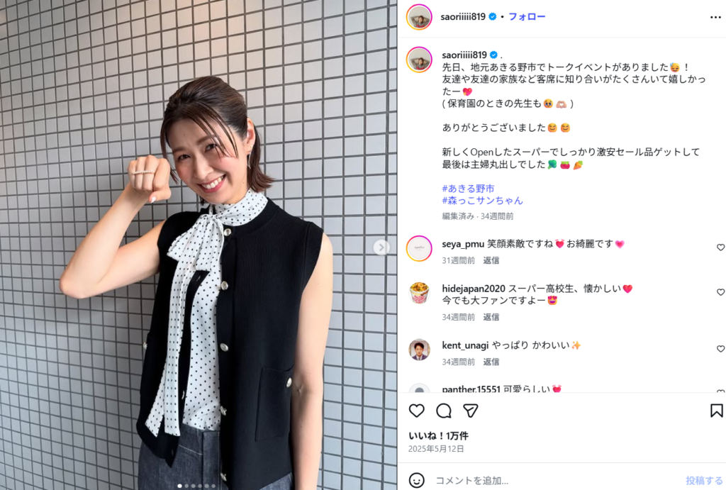 最近では、活動の拠点を大阪から関東へと移し、メディア出演やイベント、そしてバレーボール普及活動などのキャリアを大切にしながらも、家族との時間を最優先にするという、現代的でバランスの取れたライフスタイルを確立しているようです。